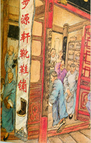 鞋坊老板姓步名源,為人敦厚老實(shí),手藝非凡,在坊間口碑甚佳。鞋坊做的鞋用料考究,做工精良,選用上佳麻繩納底,粗細(xì)均勻的麻線圍邊,做成的鞋子不但舒服而且經(jīng)久耐磨。